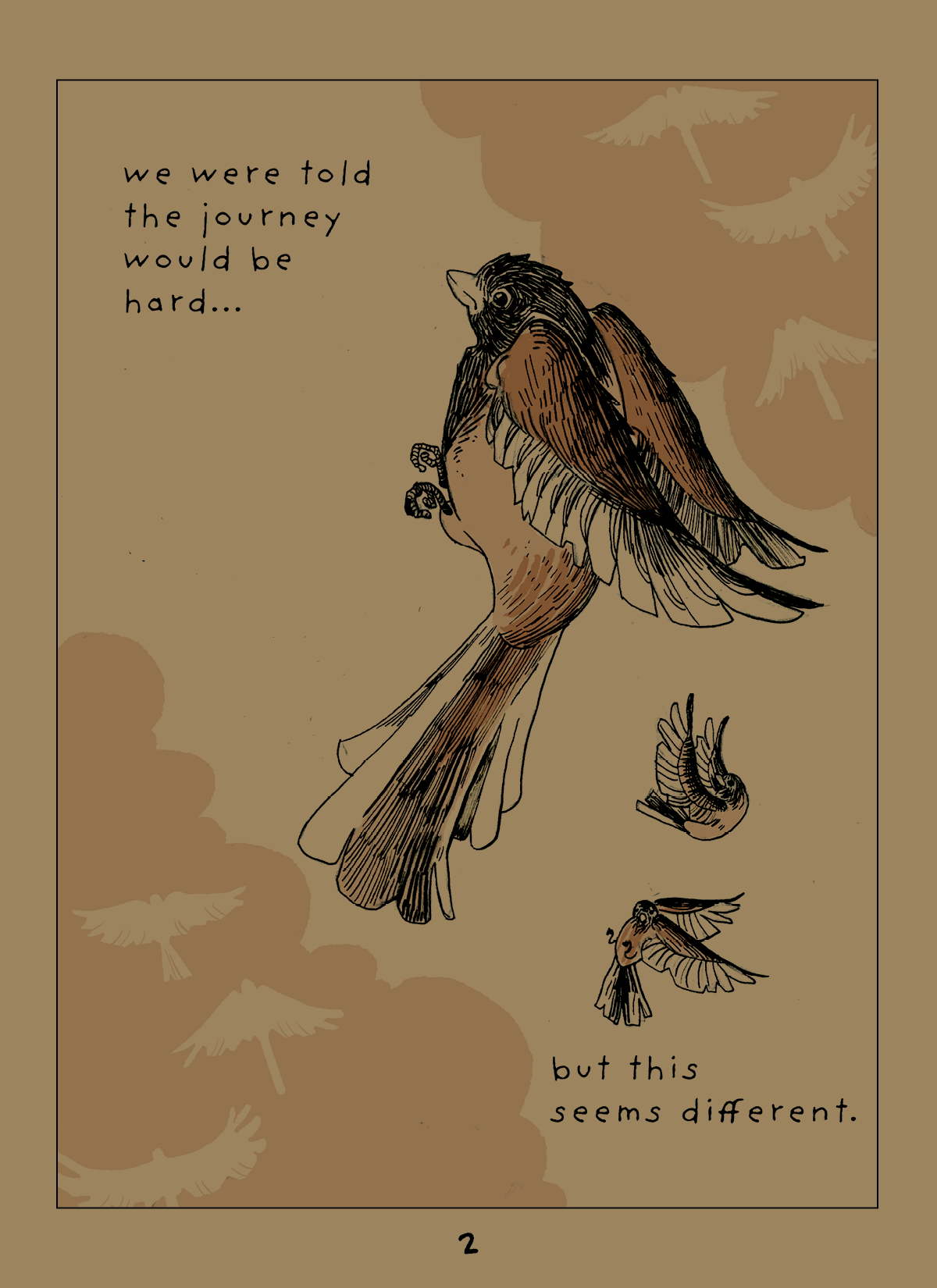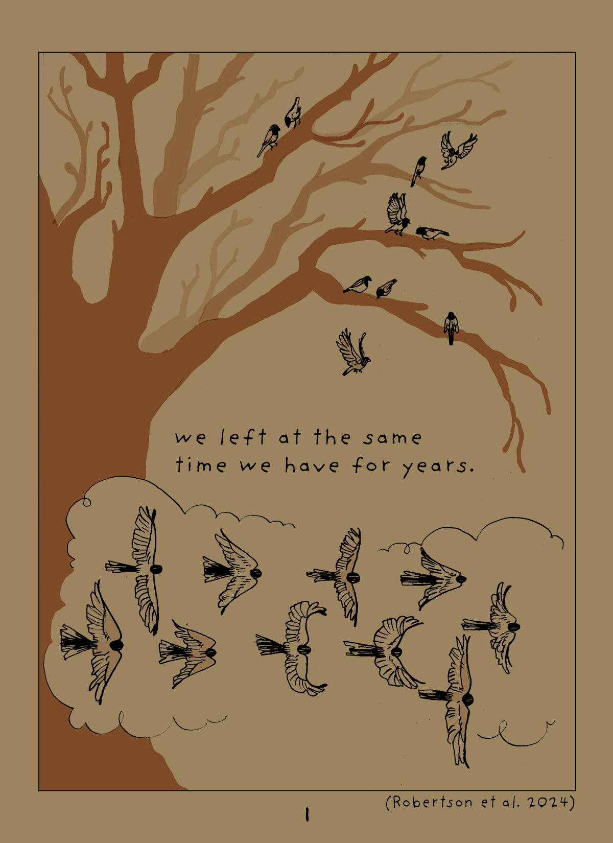 Birds have been migrating for years, but the world is changing around them. When winter gets warm and cold suddenly, it can have devastating effects on local insect and plant populations, making things dangerous for migrating birds. This zine illustrates some challenges that migratory small bird species face when moving in an increasingly hostile climate.